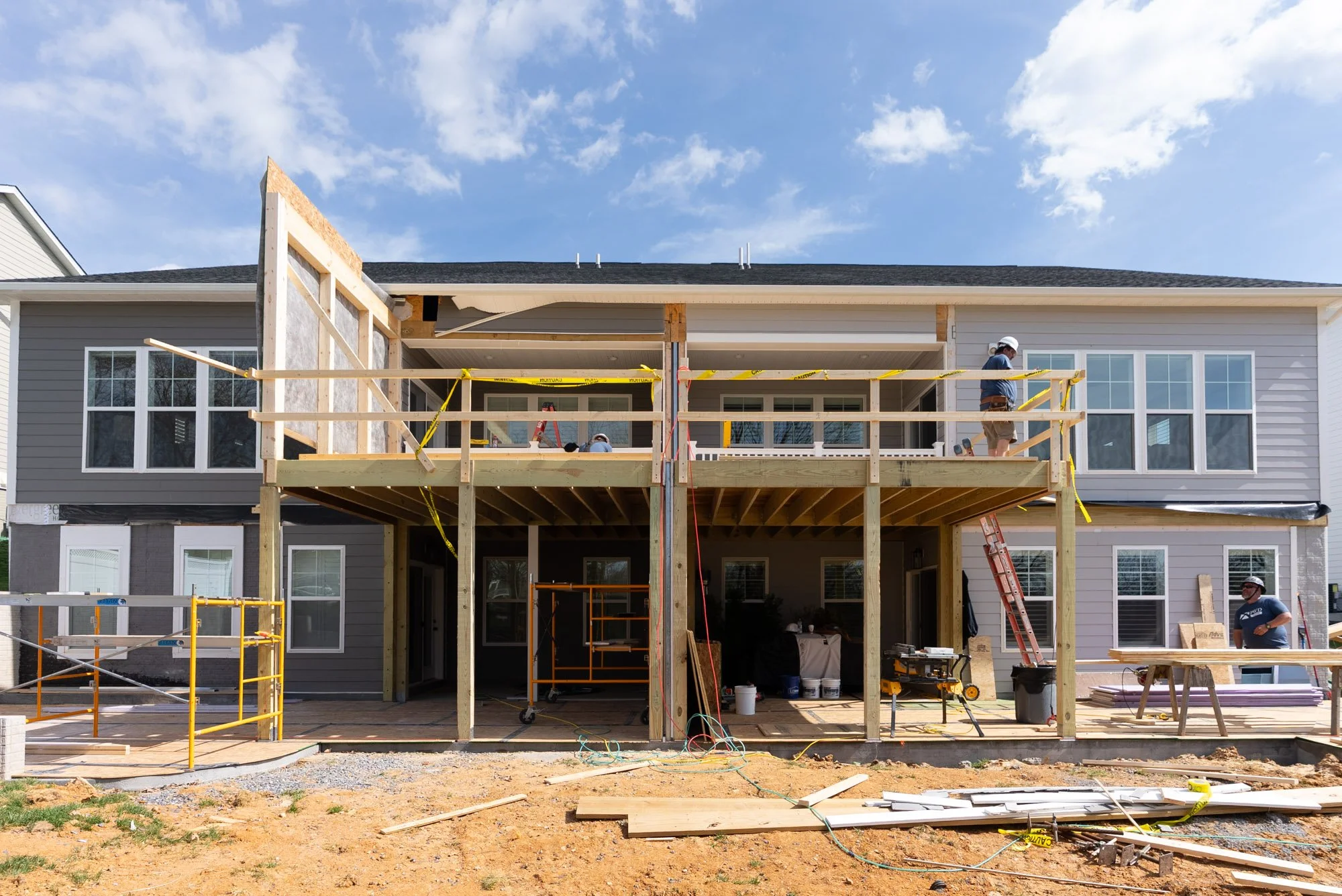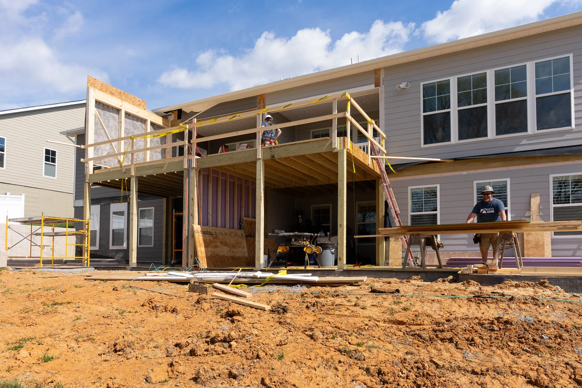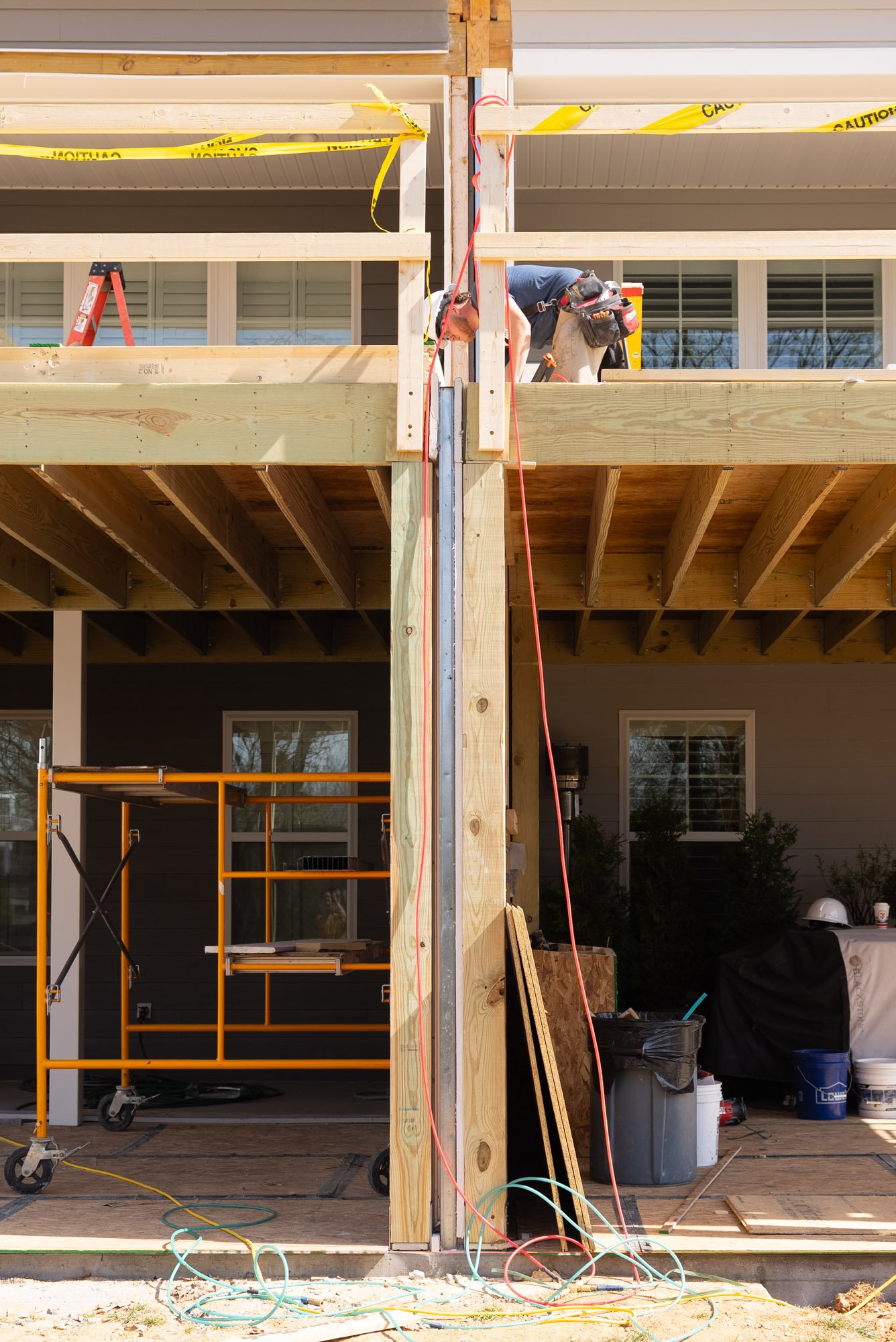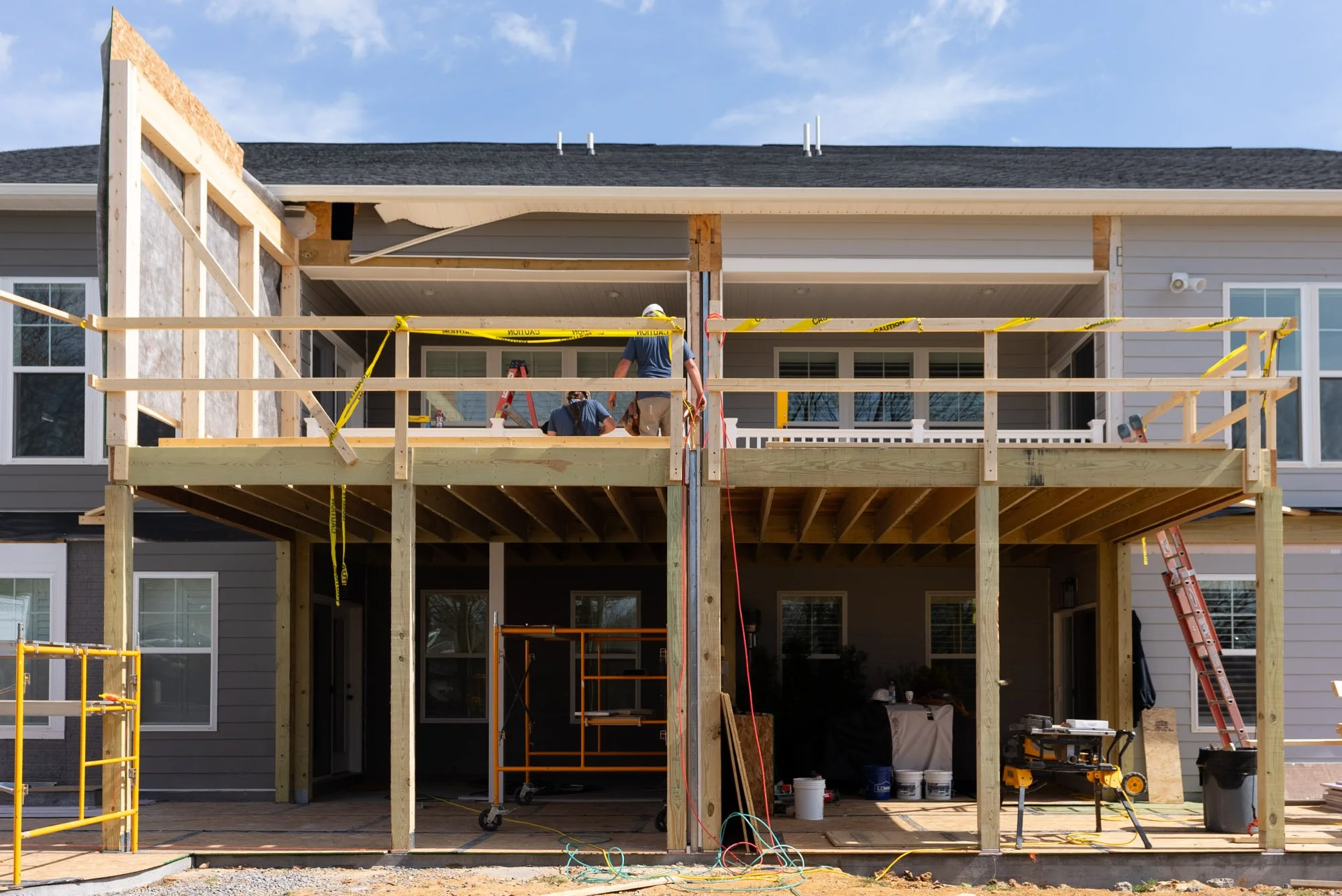 This coordination continues up through the roofline, where the new structure and existing framing come together to create a cohesive build from front to back. These steps ensure the addition functions as one unified extension of the homes while maintaining the necessary separation between each unit.