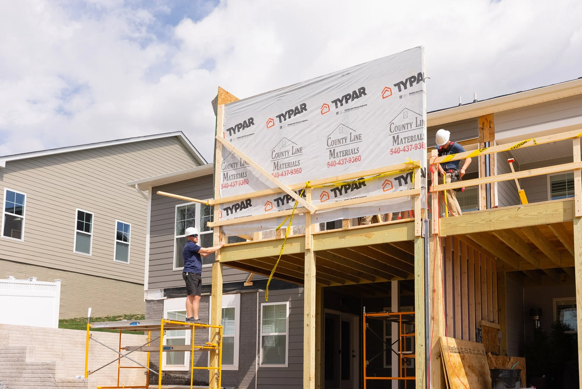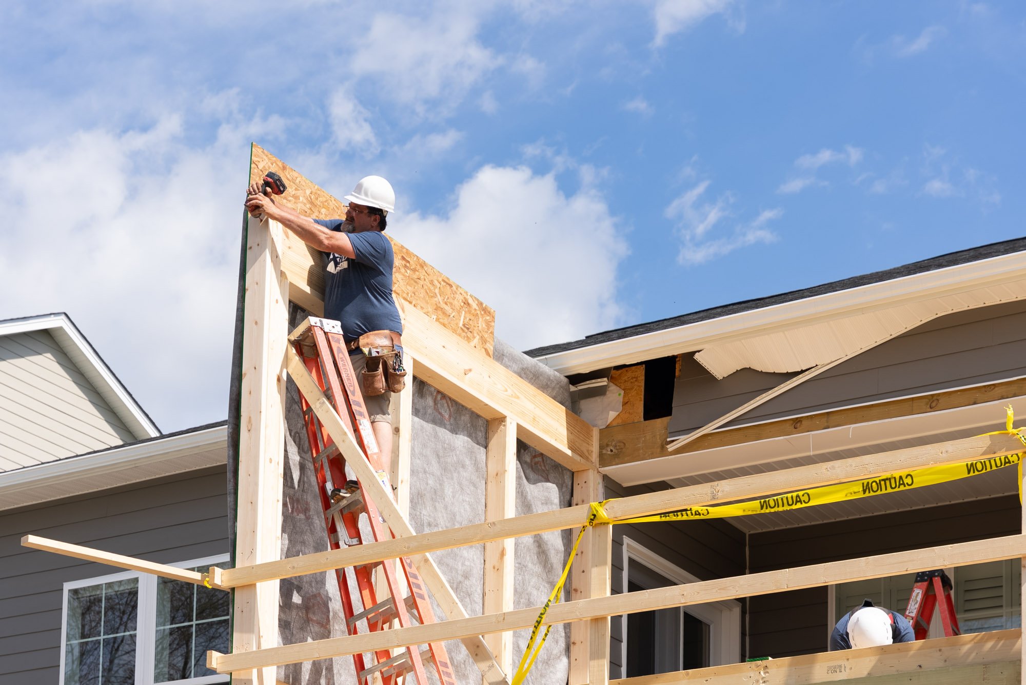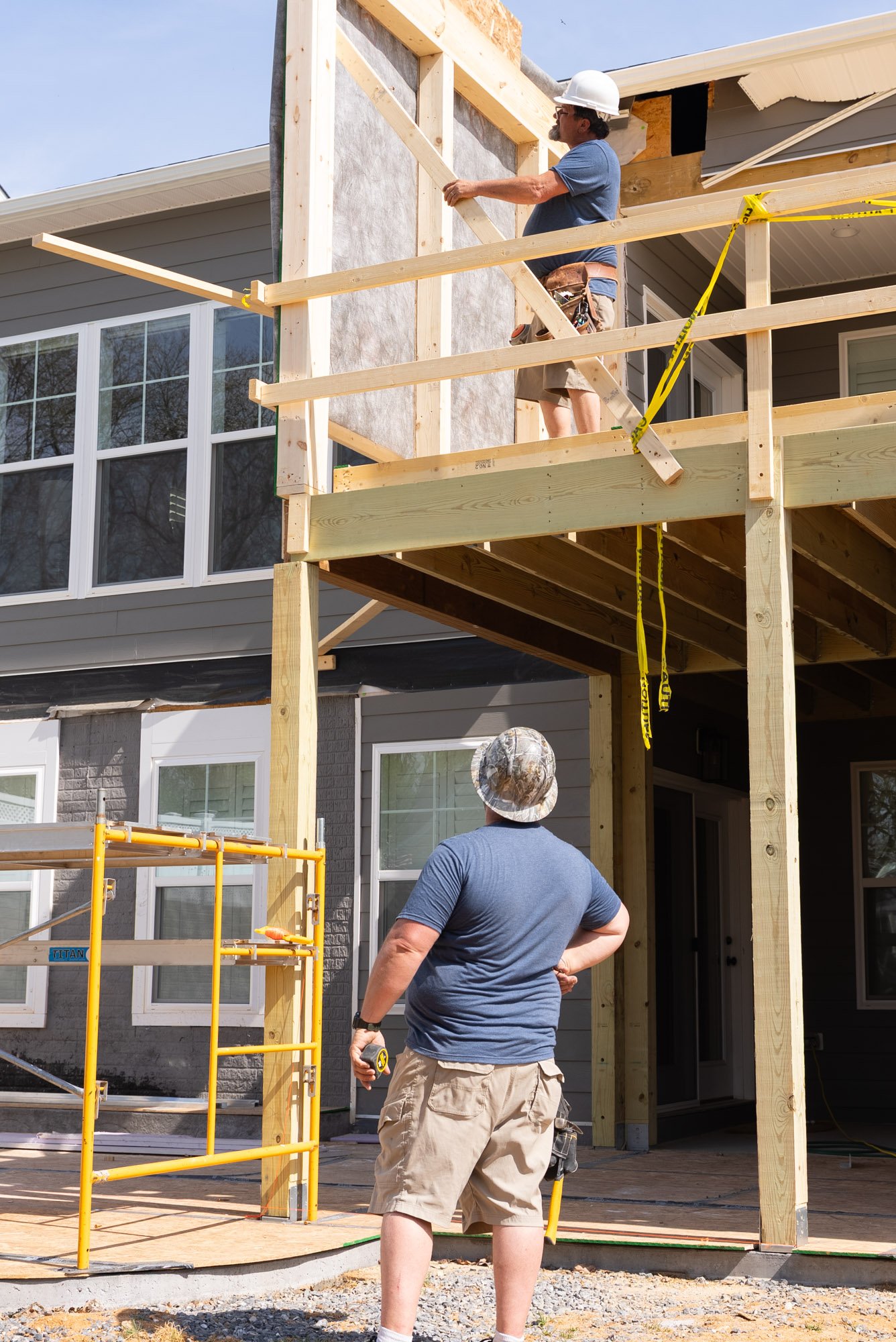 This coordination continues up through the roofline, where the new structure and existing framing come together to create a cohesive build from front to back. These steps ensure the addition functions as one unified extension of the homes while maintaining the necessary separation between each unit.