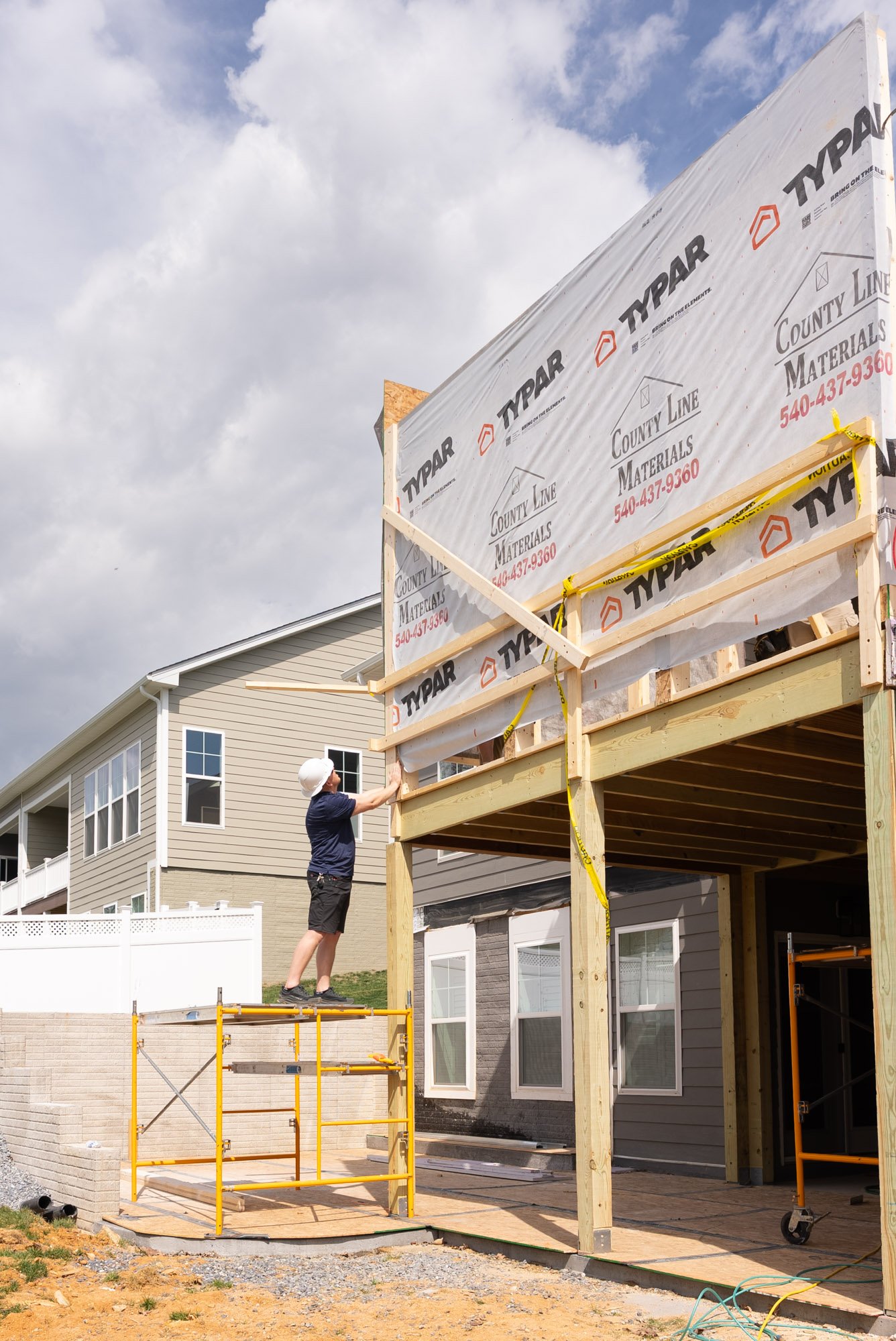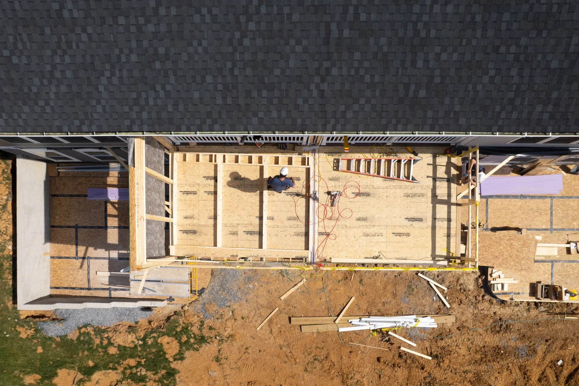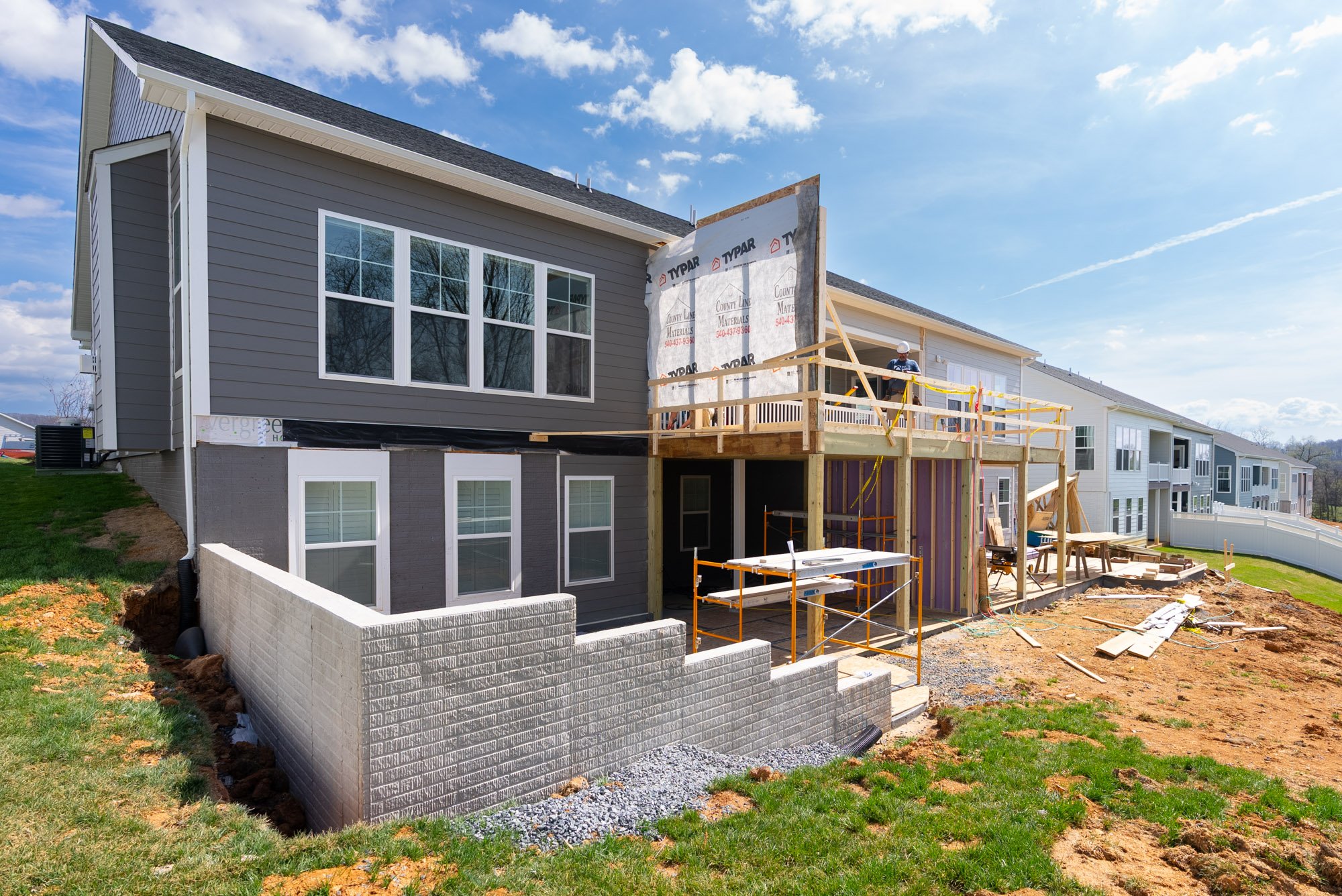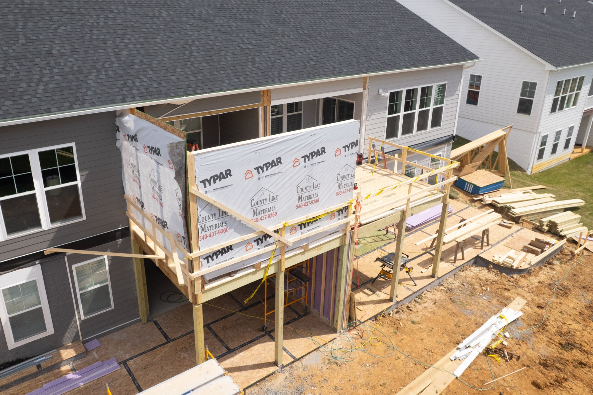This coordination continues up through the roofline, where the new structure and existing framing come together to create a cohesive build from front to back. These steps ensure the addition functions as one unified extension of the homes while maintaining the necessary separation between each unit.