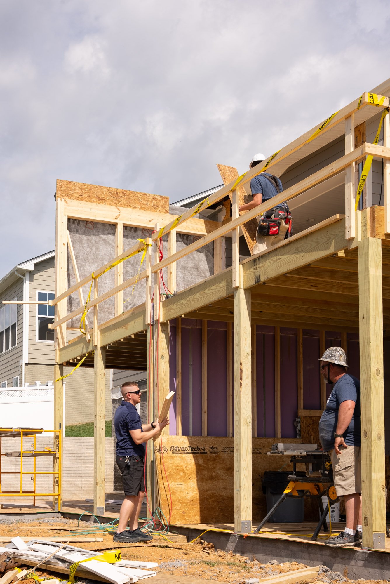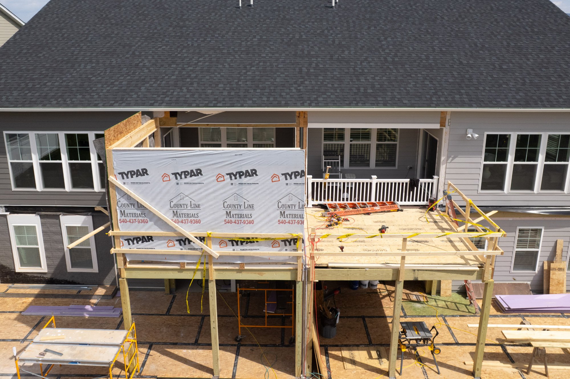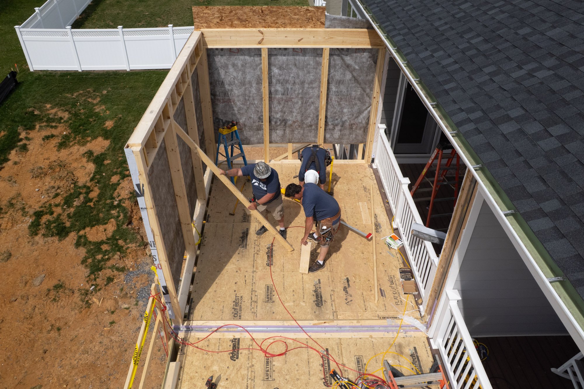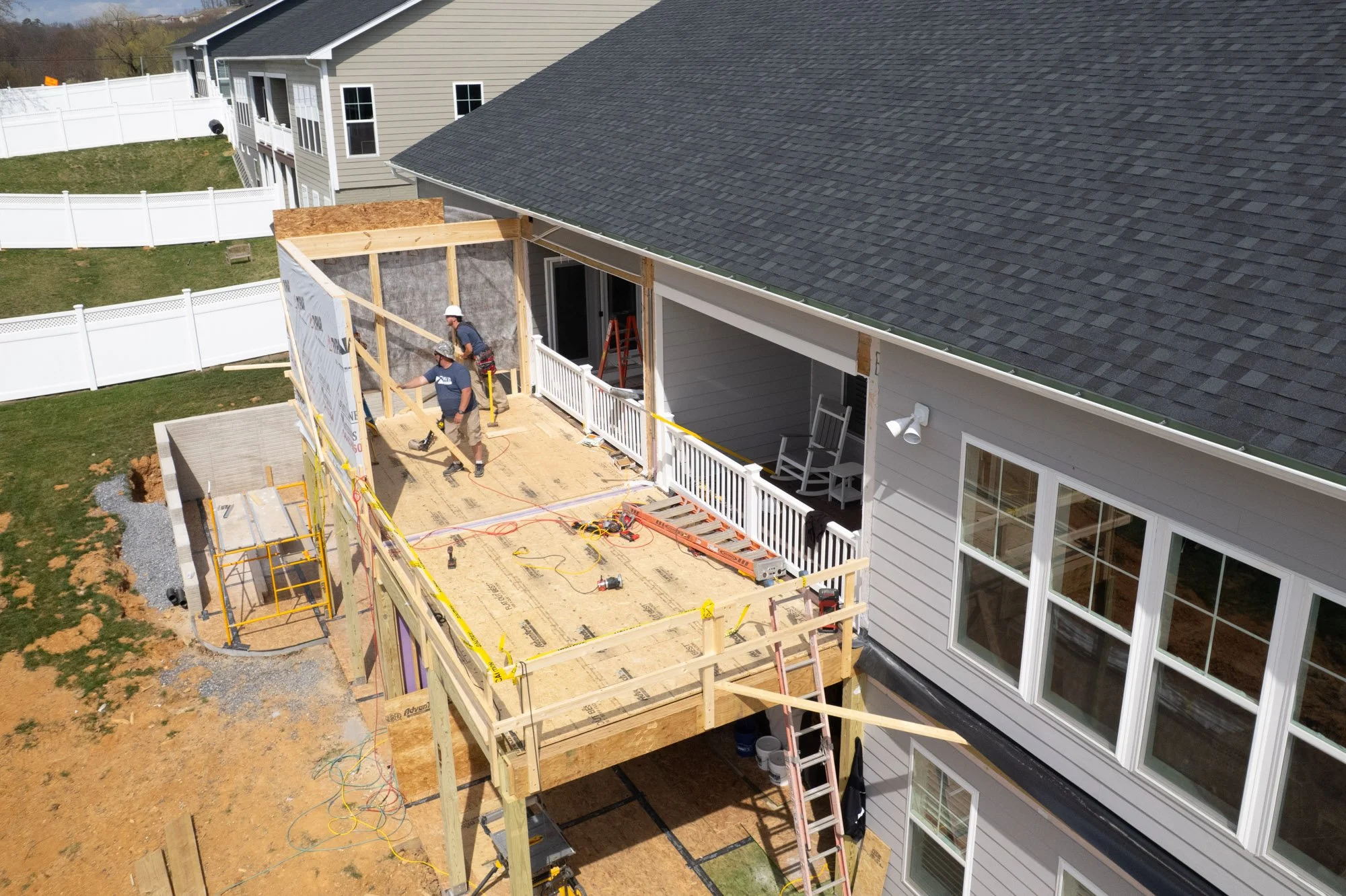 Once the walls are set, we'll install trusses spanning the enclosed section and tie the roof structure back into the existing home. After the central space is dried in, we'll shift to the two exterior decks extending out from either side of the enclosed porch — open outdoor spaces that will feel connected to the overall addition while giving each homeowner room to enjoy the outdoors.