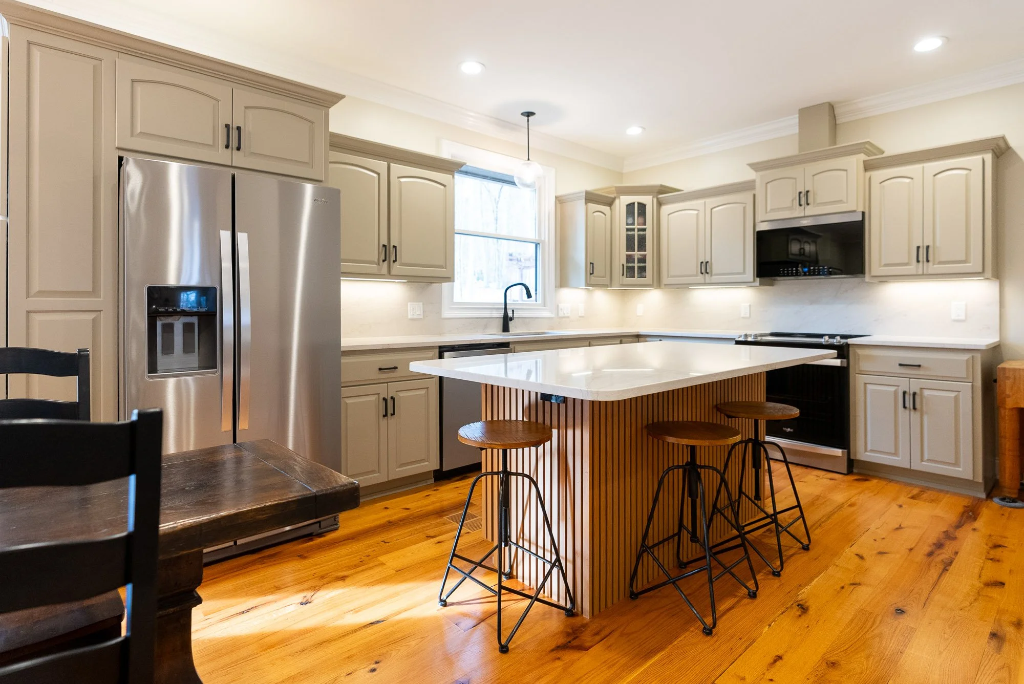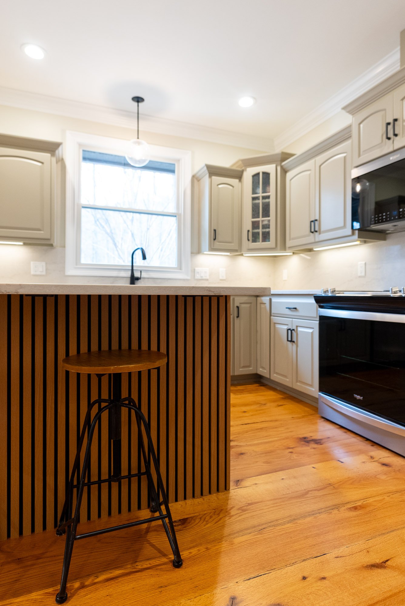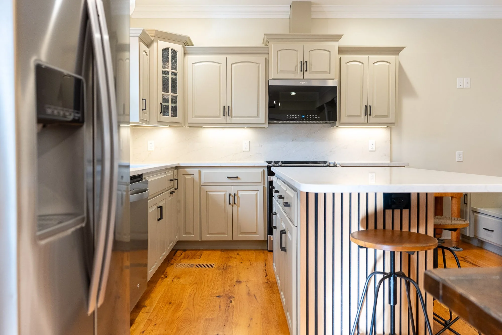 To help the island act as a center focal point for the kitchen, luxury wood slat paneling was installed along the front. The natural texture of the wood helps the island stand out without overwhelming the rest of the kitchen.