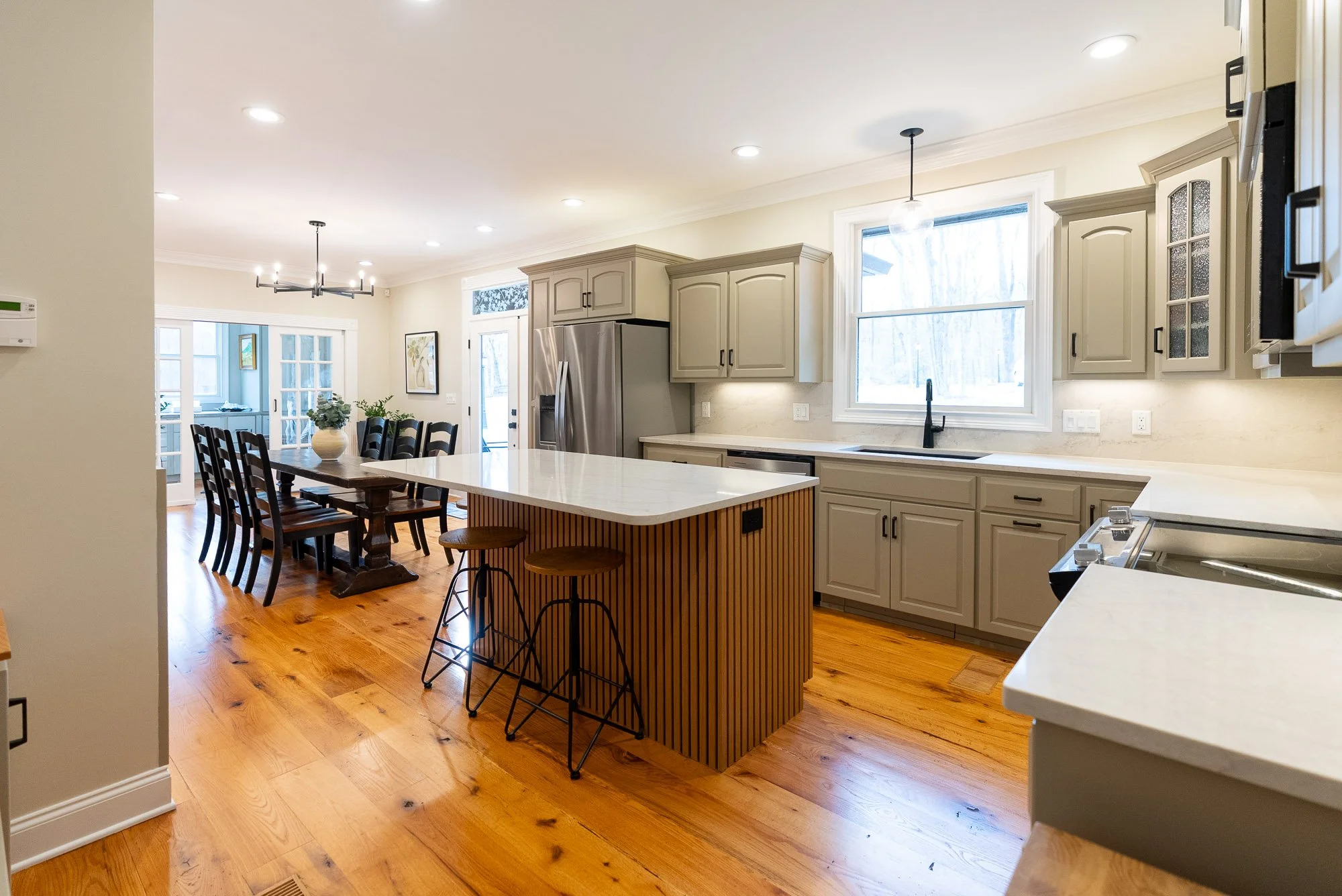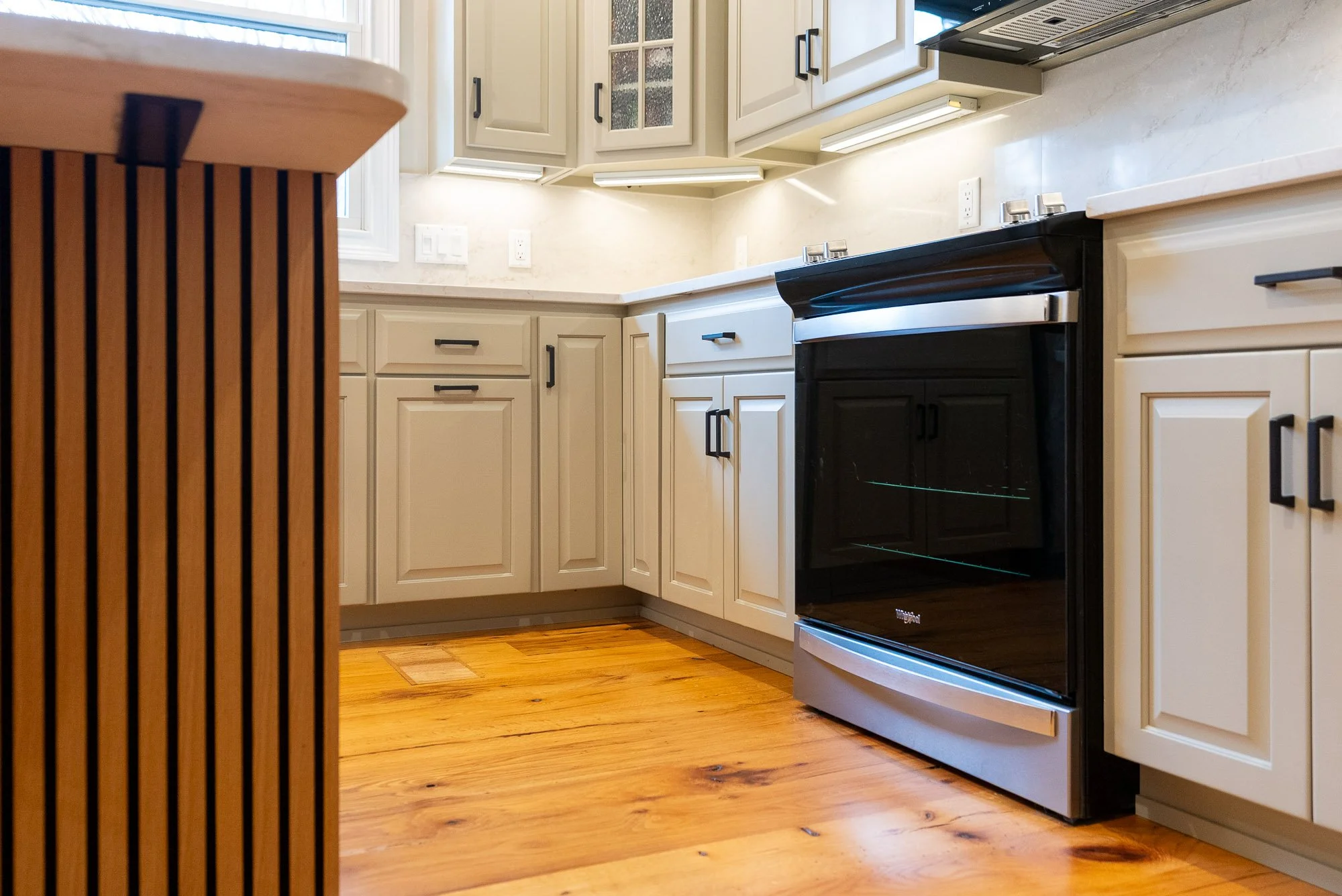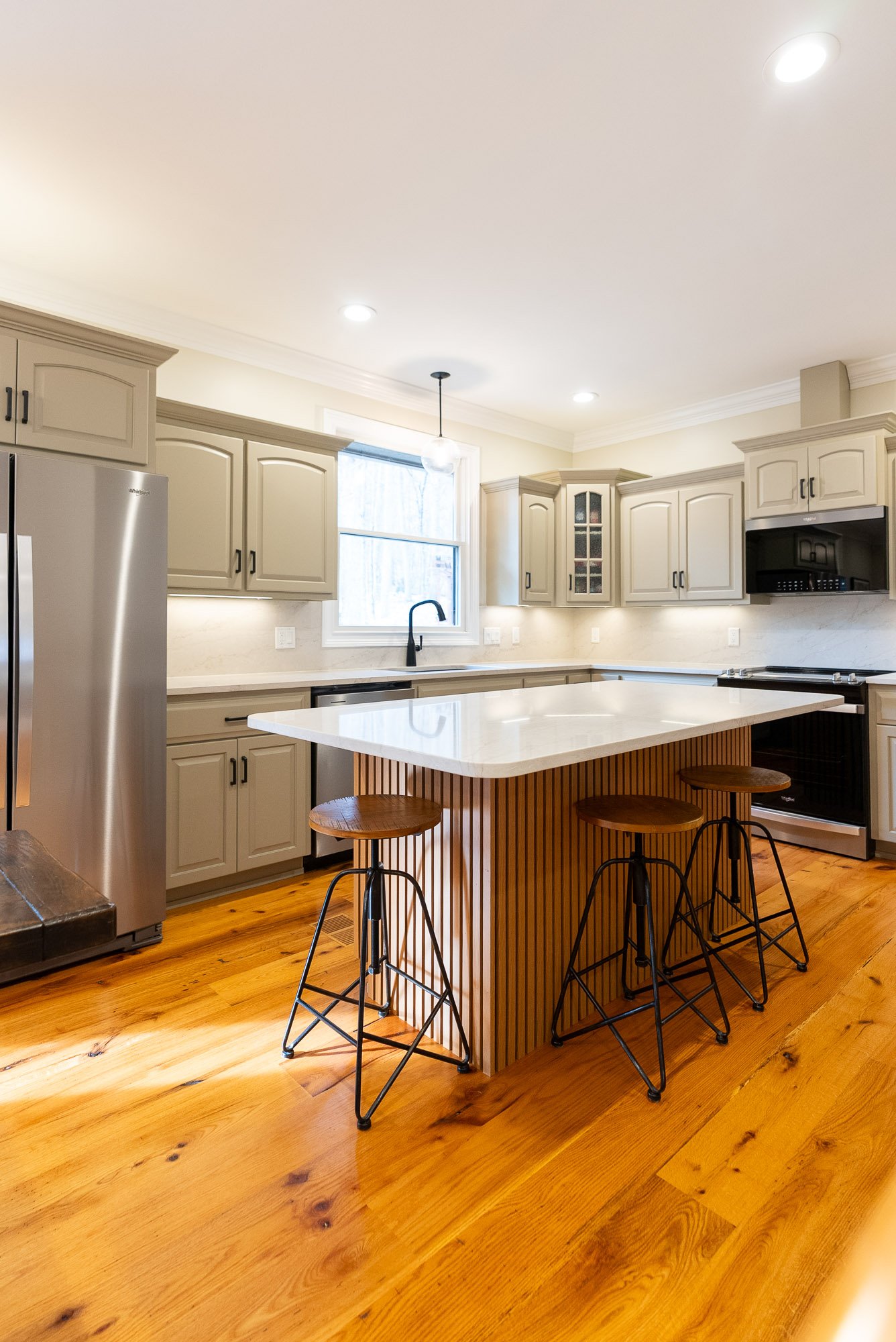 To help the island act as a center focal point for the kitchen, luxury wood slat paneling was installed along the front. The natural texture of the wood helps the island stand out without overwhelming the rest of the kitchen.