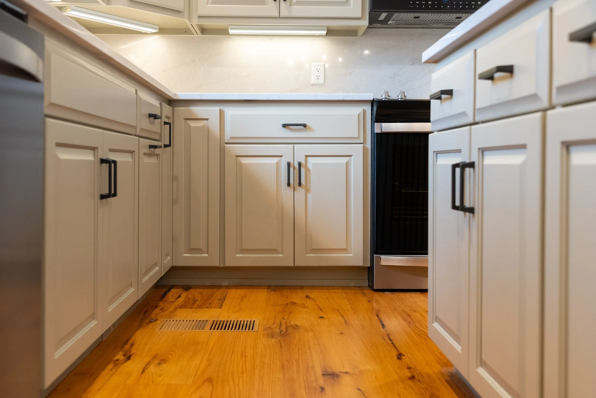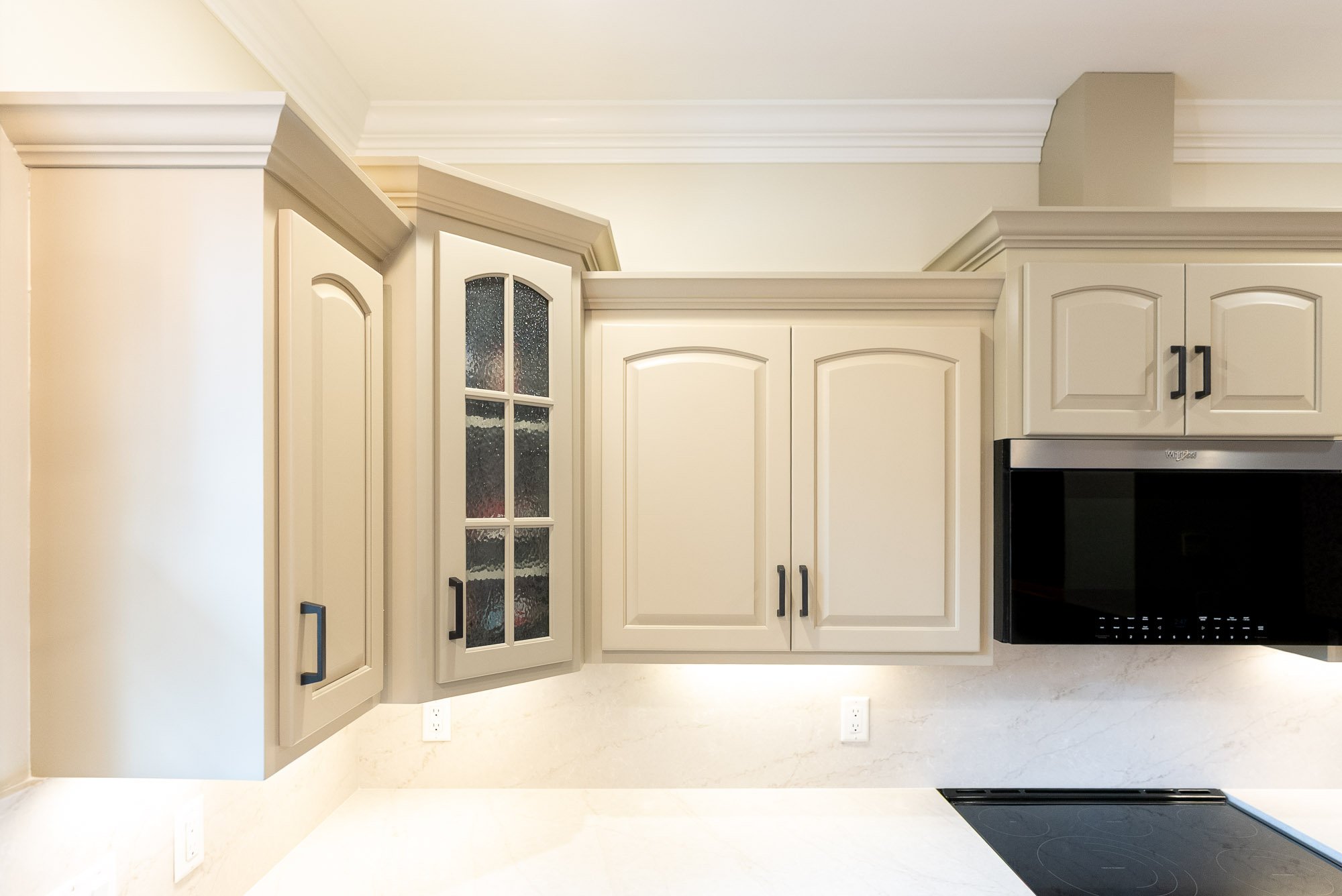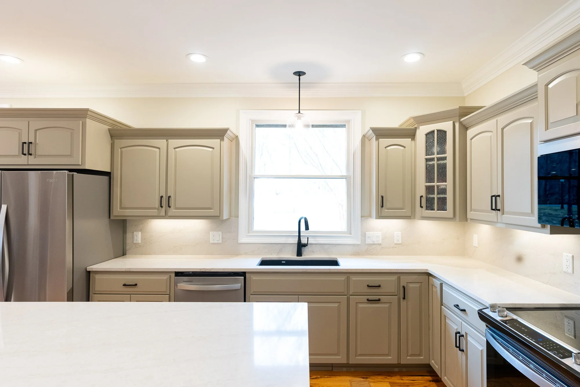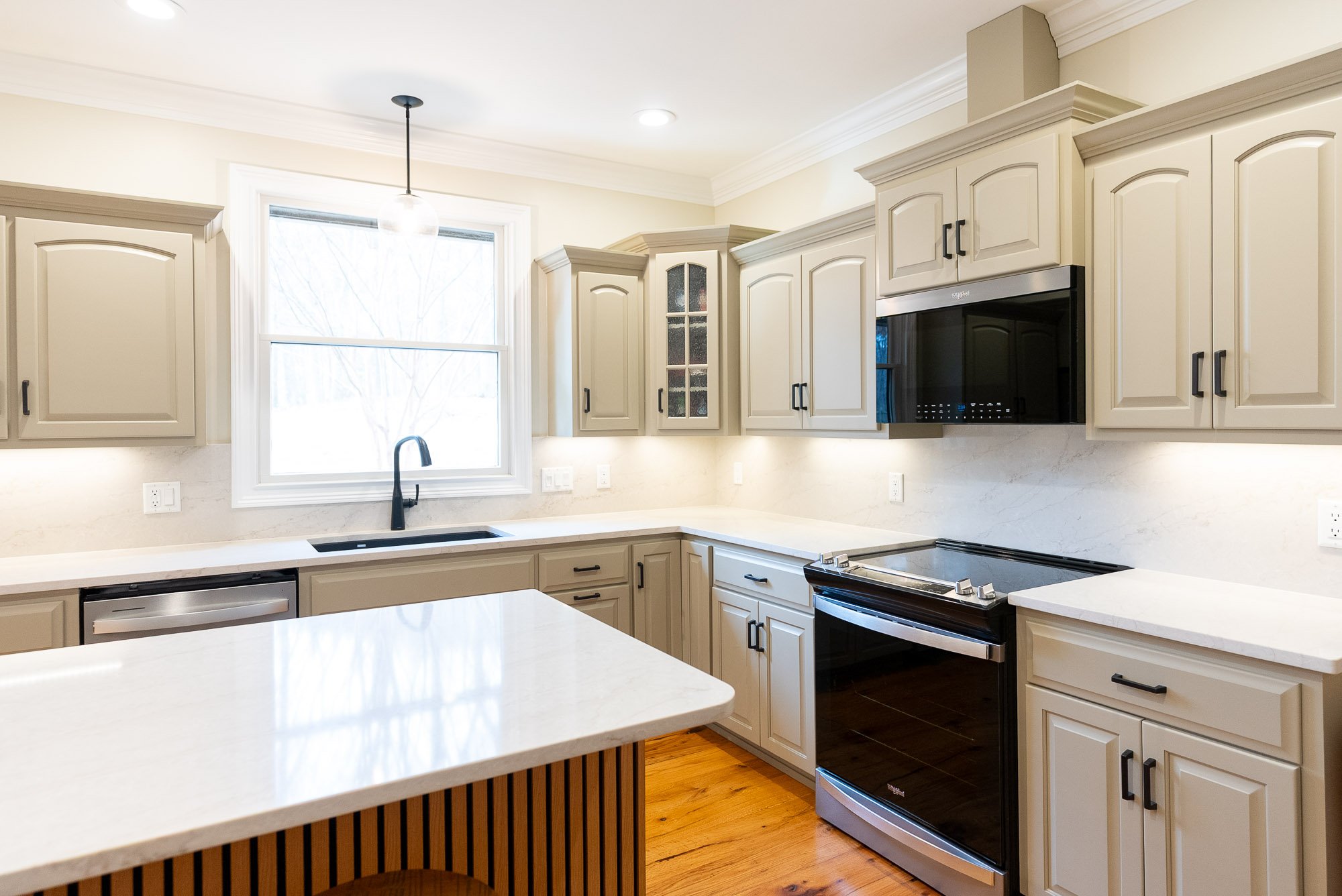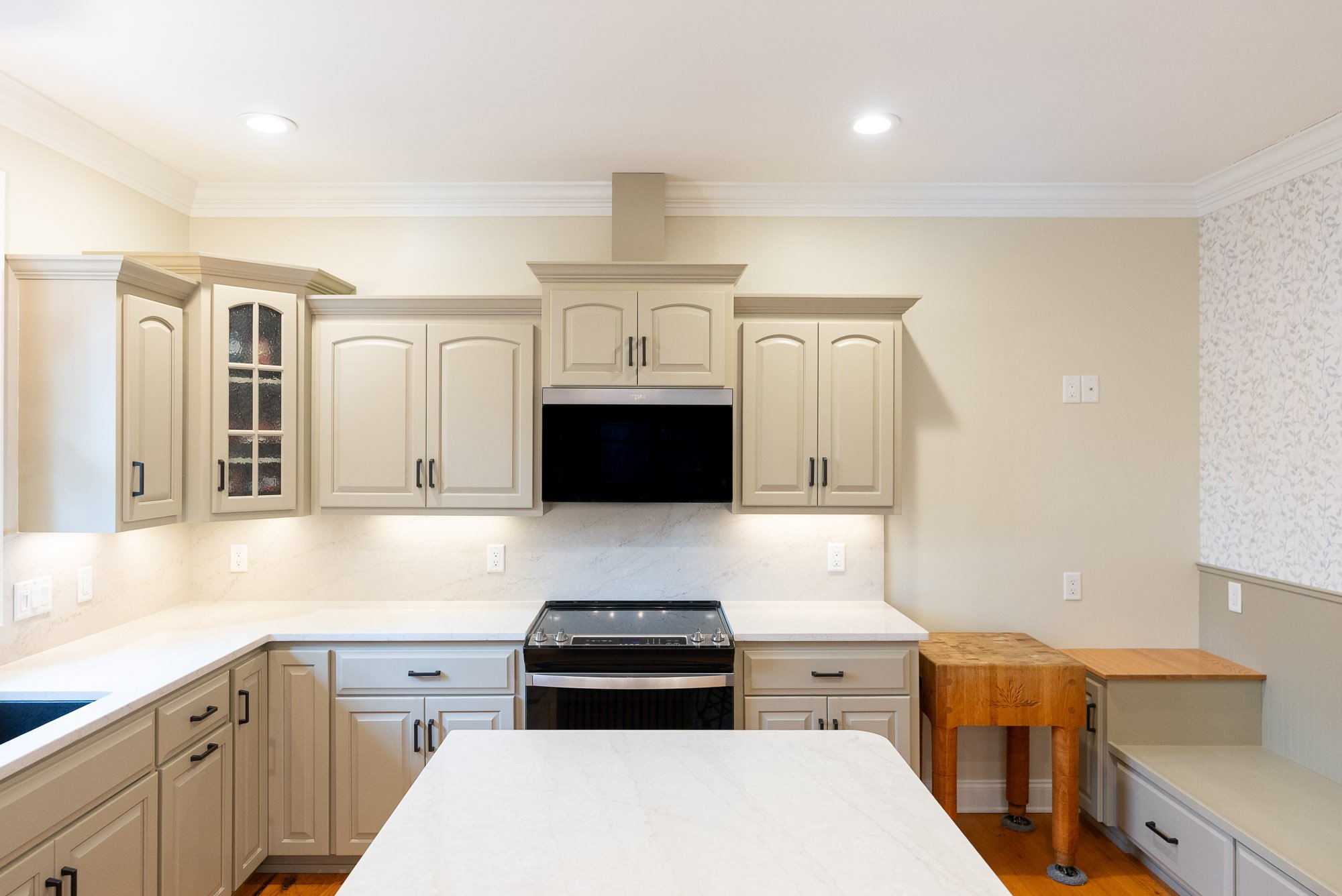 New cabinets were built specifically for this kitchen, thoughtfully customized to reflect the style and finish of the cabinetry in the home office. This approach creates a sense of continuity throughout the home, making the kitchen feel connected to the rest of the space while still standing on its own. To complete the look, a custom range hood cabinet was added, carefully designed to complement the new cabinetry and provide a focal point over the cooking area. Every detail was considered so the cabinets not only look great but also function beautifully for everyday use.