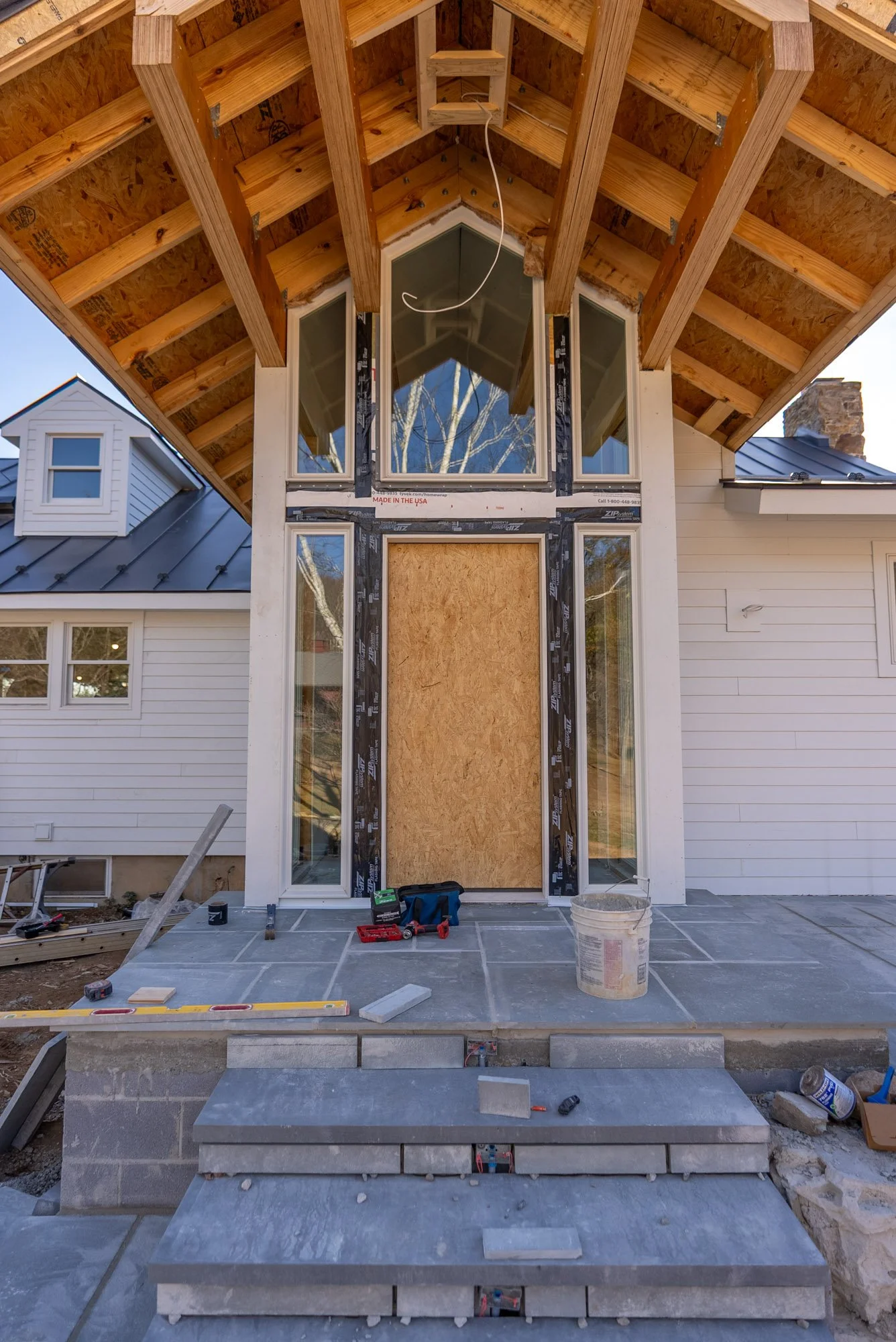 One of the more challenging aspects of the project was the entryway. Beams extended from the interior out to the porch roof, leaving little room to work with. We had to fit the new windows within those tight boundaries, follow the roof pitch, and ensure all angles aligned correctly. The finished entryway came together smoothly and we’re proud to deliver this key feature to the homeowners.